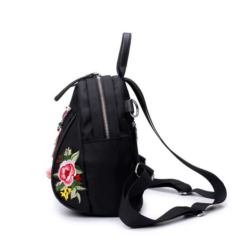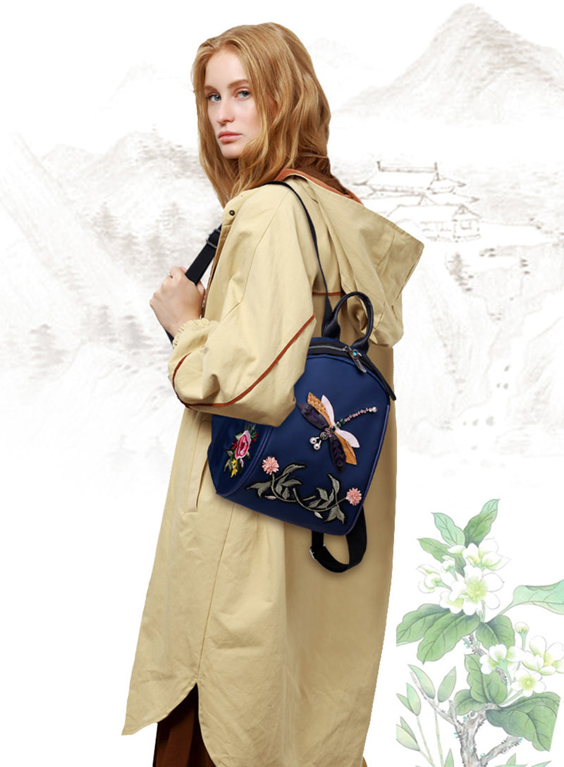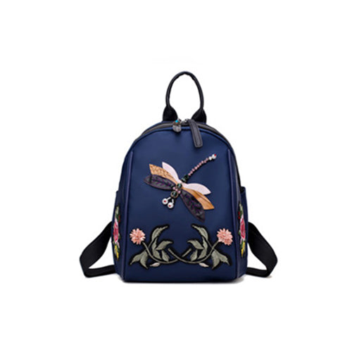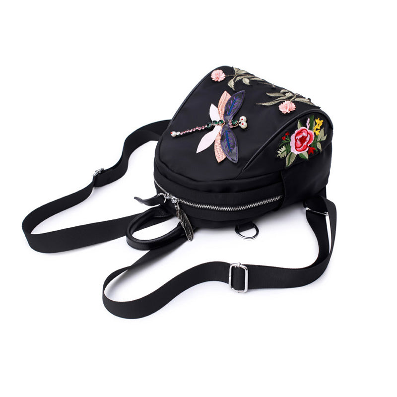 Fabra Small Waterproof Nylon Women Backpack Embroidery Flower Shoulder Bag Dragonfly